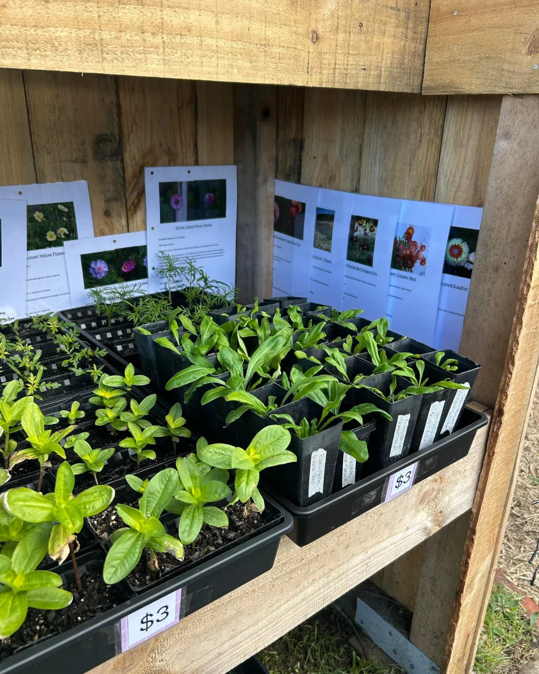 What started as a few pots in the backyard became something I genuinely enjoy tending to each week. The stand is filled with home-grown seedlings, herbs, and flowers, restocked regularly for anyone local who wants to stop by.