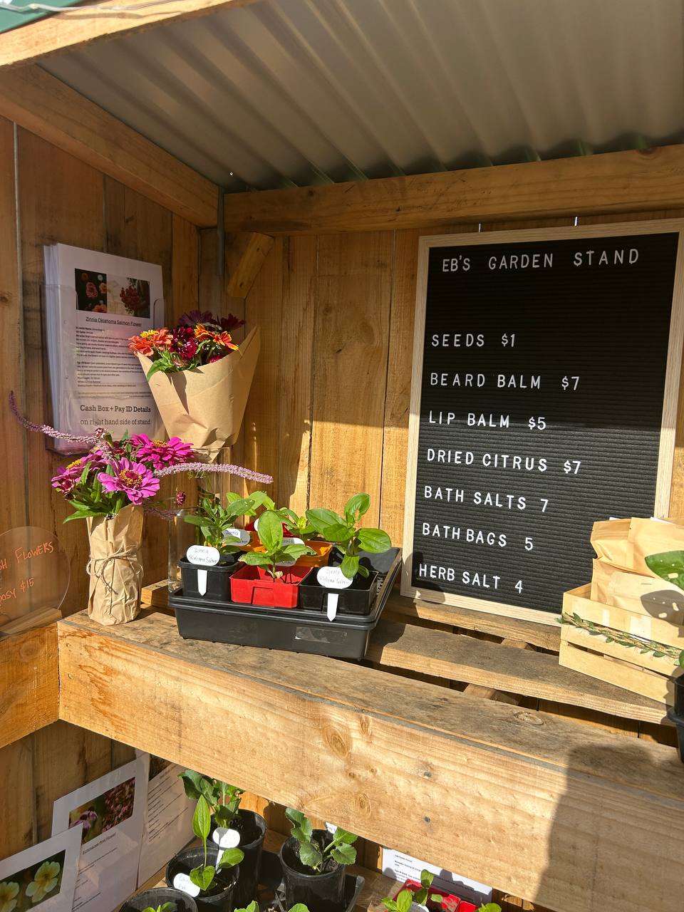 What started as a few pots in the backyard became something I genuinely enjoy tending to each week. The stand is filled with home-grown seedlings, herbs, and flowers, restocked regularly for anyone local who wants to stop by.